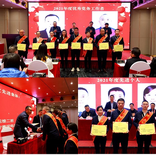 九河电力党委副书记、总经理肖军宣读了《中共四川九河电力股份有限公司委员会关于表彰2021年度先进党支部、优秀共产党员和优秀党务工作者的决定》《四川九河电力股份有限公司关于表彰2021年度先进集体和先进个人的决定》,与会领导为各项荣誉称号获得部门和个人颁奖。优秀共产党员代表、先进集体代表作交流发言,欧家村电站、外协运行部、工程分公司和调度营销部负责人作表态发言。