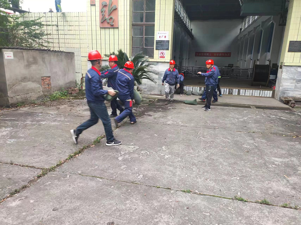 一是厂房防洪抢险,模拟主厂房进水,用防洪沙袋抢筑围堰;二是关闭所有自排水系统,启用应急水泵;三是疏通厂区排水沟;四是人员应急疏散。