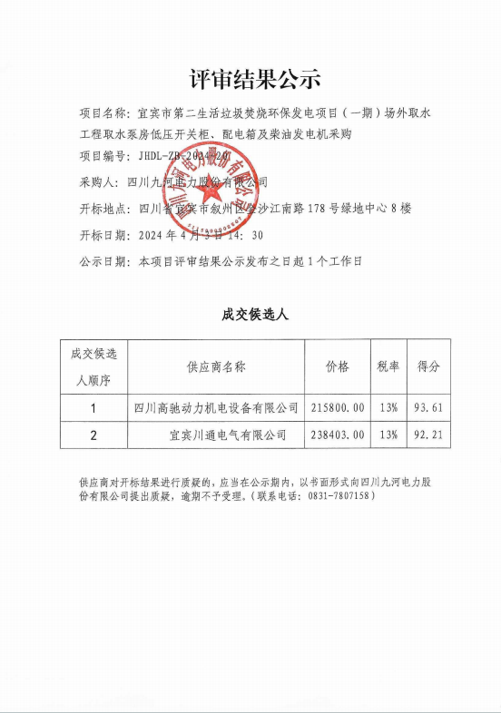 宜宾市第二生活垃圾焚烧环保发电项目(一期)场外取水工程取水泵房低压开关柜、配电箱及柴油发电机采购评审结果公示