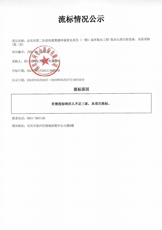 宜宾市第二生活垃圾焚烧环保发电项目(一期)场外取水工程-取水头部自控设备、水泵采购(第二次)流标情况公示
