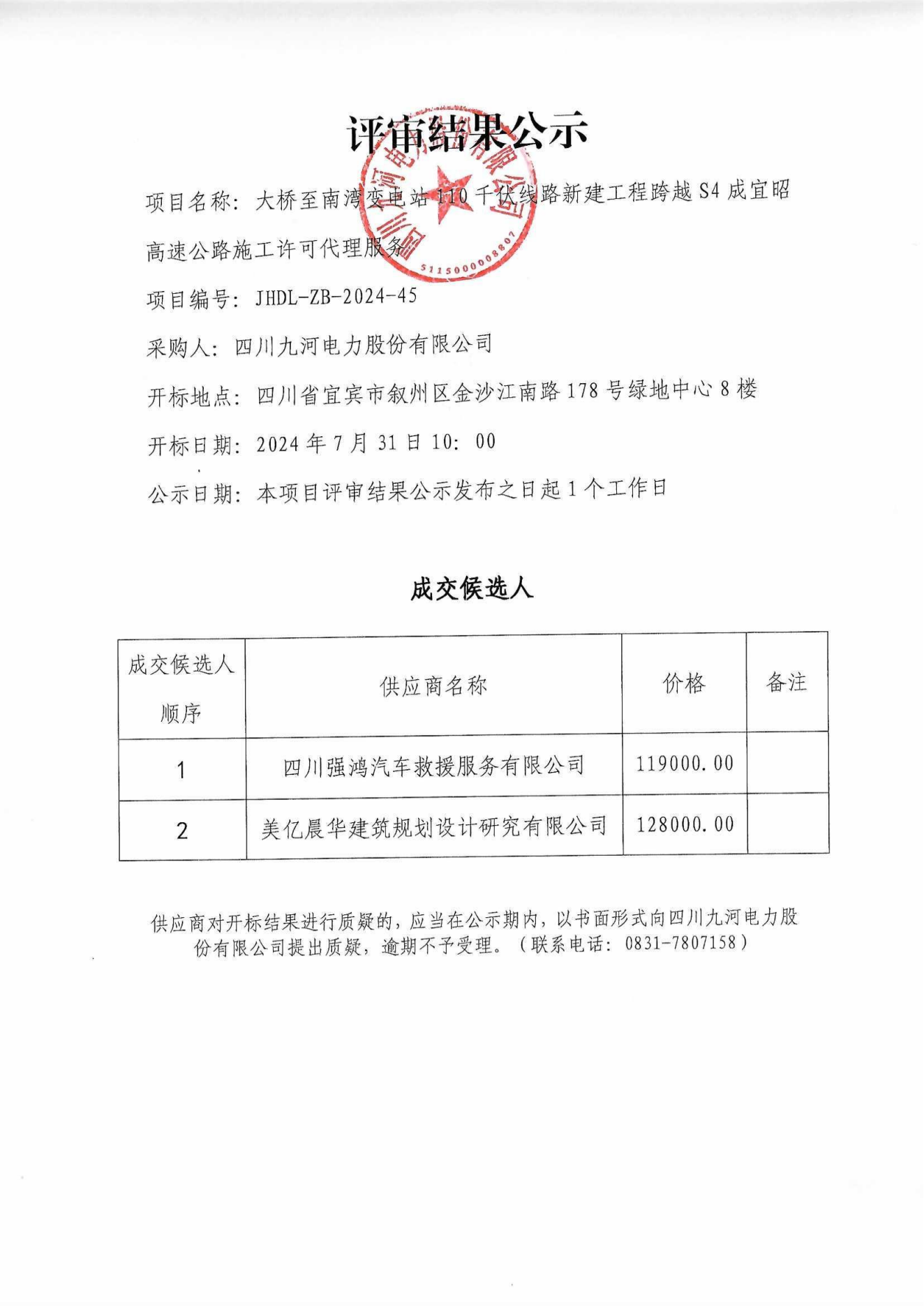大桥至南湾变电站110千伏线路新建工程跨越S4成宜昭高速公路施工许可代理服务评审结果公示