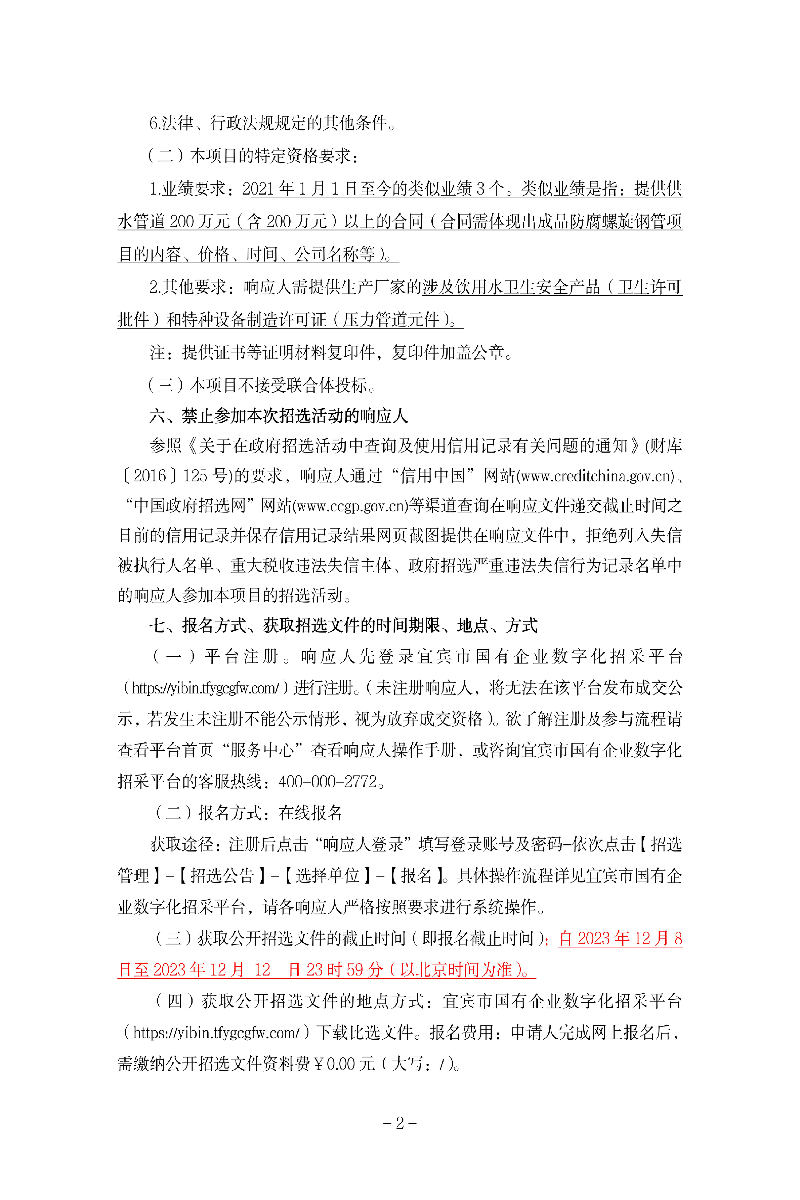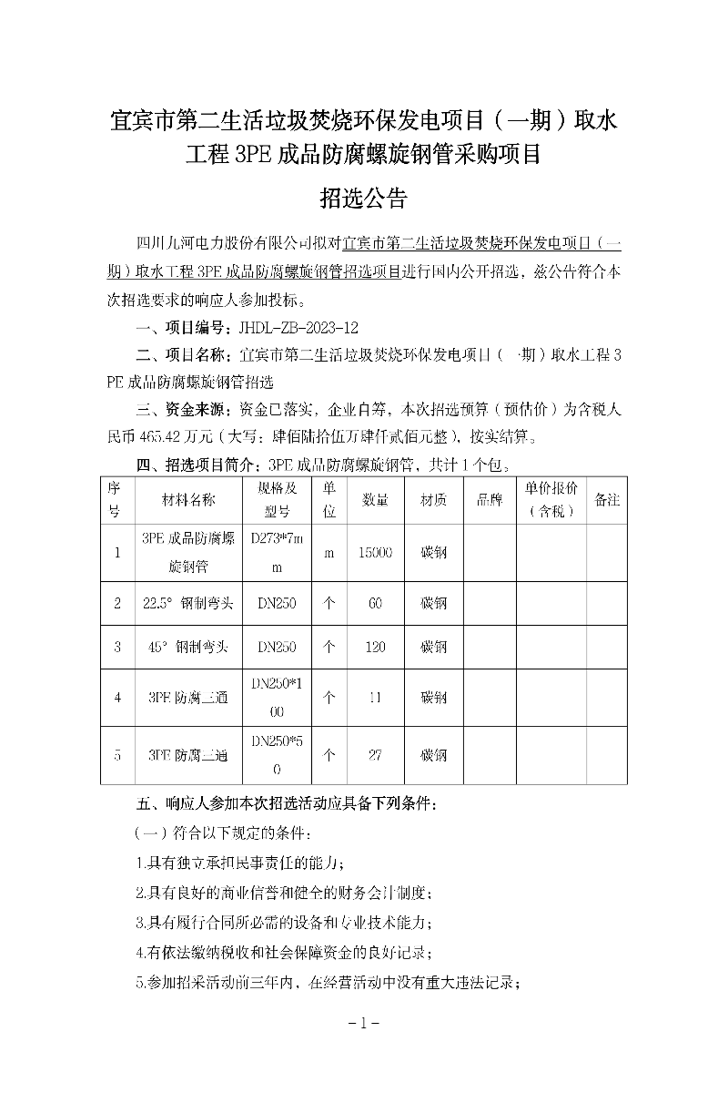 宜宾市第二生活垃圾焚烧环保发电项目(一期)取水工程3PE成品防腐螺旋钢管采购项目招选公告