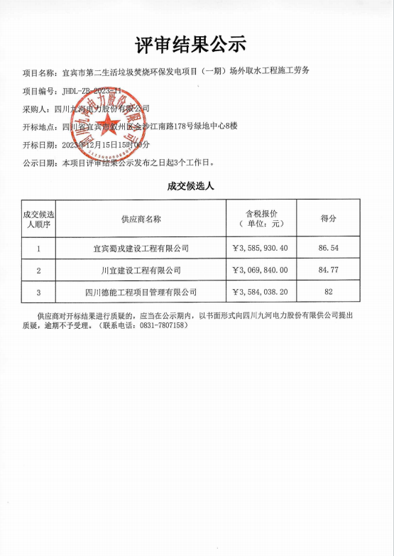宜宾市第二生活垃圾焚烧环保发电项目(一期)场外取水工程施工劳务