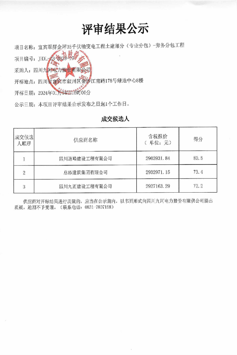 宜宾翠屏金坪35千伏输变电工程土建部分(专业分包)-劳务分包工程评审结果公示